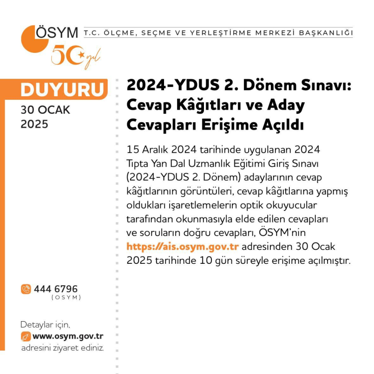 ANKARA (İGFA) - ÖSYM, 15 Aralık 2024 tarihinde gerçekleştirilen 2024-YDUS 2. dönem sınavının değerlendirme işlemlerini tamamladı.