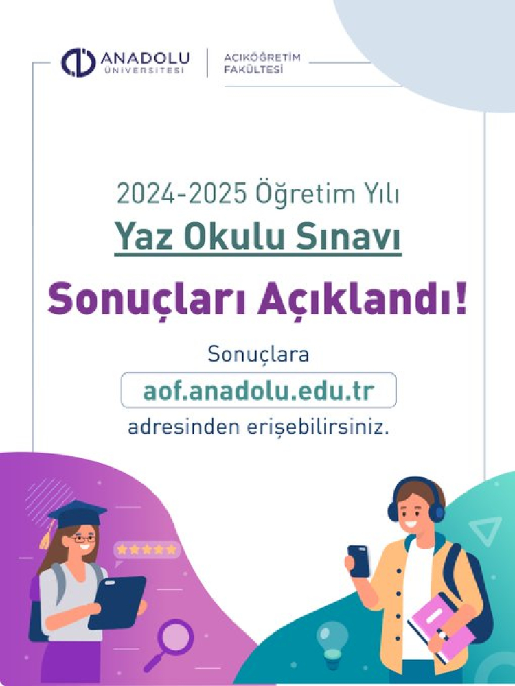 Anadolu Üniversitesi, 2024-2025 Yaz Okulu sınav sonuçlarının erişime açıldığını duyurdu. Öğrenciler, sonuçlarını aof.anadolu.edu.tr adresinden öğrenilebiliyor.