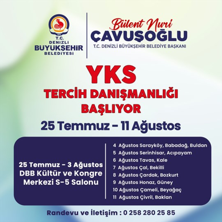 YKS tercihleri 30 Temmuz – 11 Ağustos 2025 tarihleri arasında yapılacak. Bu süreçte Denizli Büyükşehir Belediyesi’nin ücretsiz danışmanlık hizmeti iki etapta gerçekleştirilecek. Tercih danışmanlığı ilk etapta, 25 Temmuz – 3 Ağustos 2025 tarihleri arasında Denizli Büyükşehir Belediyesi Kongre ve Kültür Merkezi S5 Salonu’nda, 09.00 – 17.00 saatleri arasında yapılacak. Bu yıl ilk kez ilçelere de uzanacak olan danışmanlık hizmeti, 4-11 Ağustos tarihleri arasında farklı ilçelerde gençlerle buluşacak. İlk kez ilçelerde gerçekleştirilecek bu hizmet sayesinde, şehir merkezine gelme imkânı olmayan öğrencilerin de uzman desteğine erişimi sağlanmış olacak. Üniversite tercihi yapacak adayların, tercih danışmanlığı hizmetinden yararlanabilmesi için 0 (258) 280 25 85 numaralı telefondan randevu almaları gerekiyor.