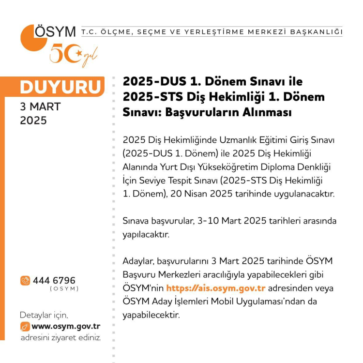 ÖSYM, 2025-DUS 1. Dönem Sınavı ile 2025-STS Diş Hekimliği 1. Dönem Sınavına yönelik başvuruların 10 Mart'a kadar alınacağını duyurdu.