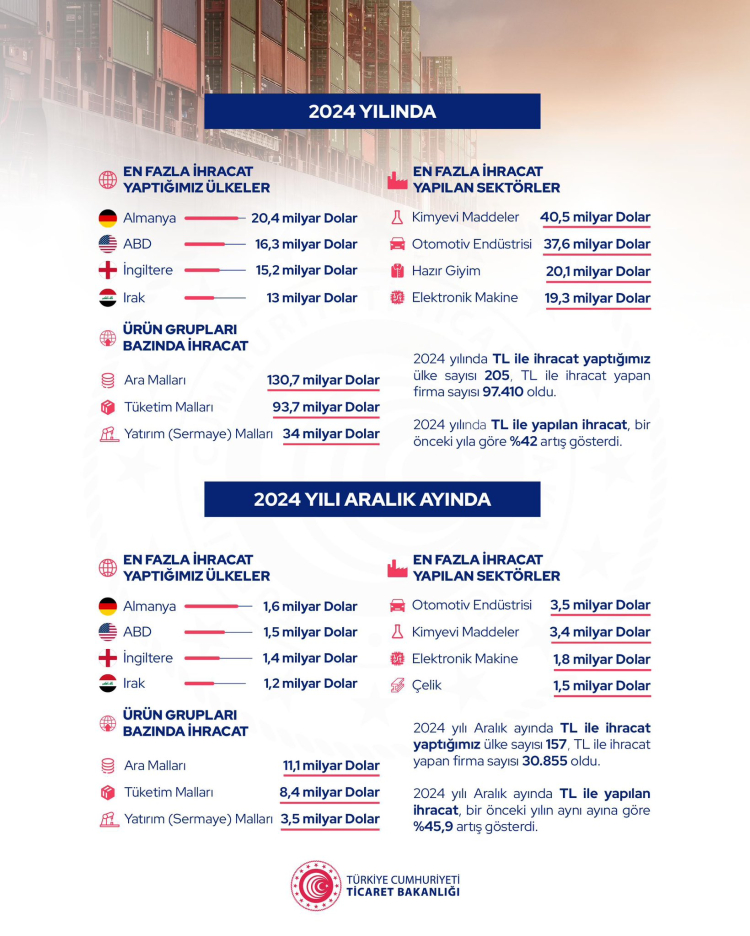 Ticaret Bakanlığı, 2024 yılına ilişkin dış ticaret verilerini açıkladı. 2024 yılında en fazla ihracat yapılan ülke 20,4 milyar Dolar ile Almanya olurken, en fazla ihracat yapılan sektör 40,5 milyar dolar ile kimyevi maddeler oldu. 2024 yılında TL ile yapılan ihracat, bir önceki yıla göre yüzde 42 artış gösterdi.