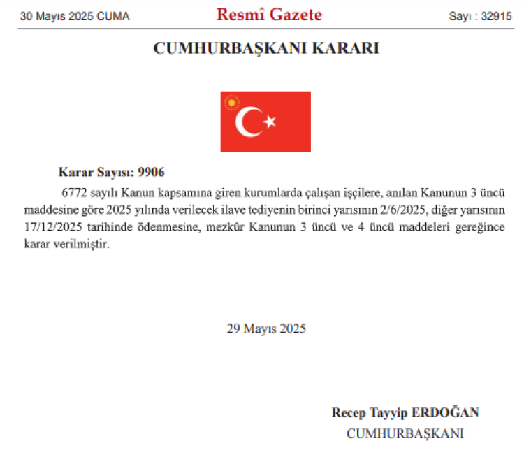 6772 Sayılı Kanun kapsamında devlet ve bağlı kurumlarda çalışan işçilere 2025 yılında yapılacak ilave tediye ödemelerinin tarihleri, Resmi Gazete’de yayımlanan 9906 sayılı Cumhurbaşkanı Kararı ile açıklandı. Ödemeler, Kurban Bayramı öncesi 2 Haziran ve 17 Aralık 2025’te iki taksit halinde yapılacak.