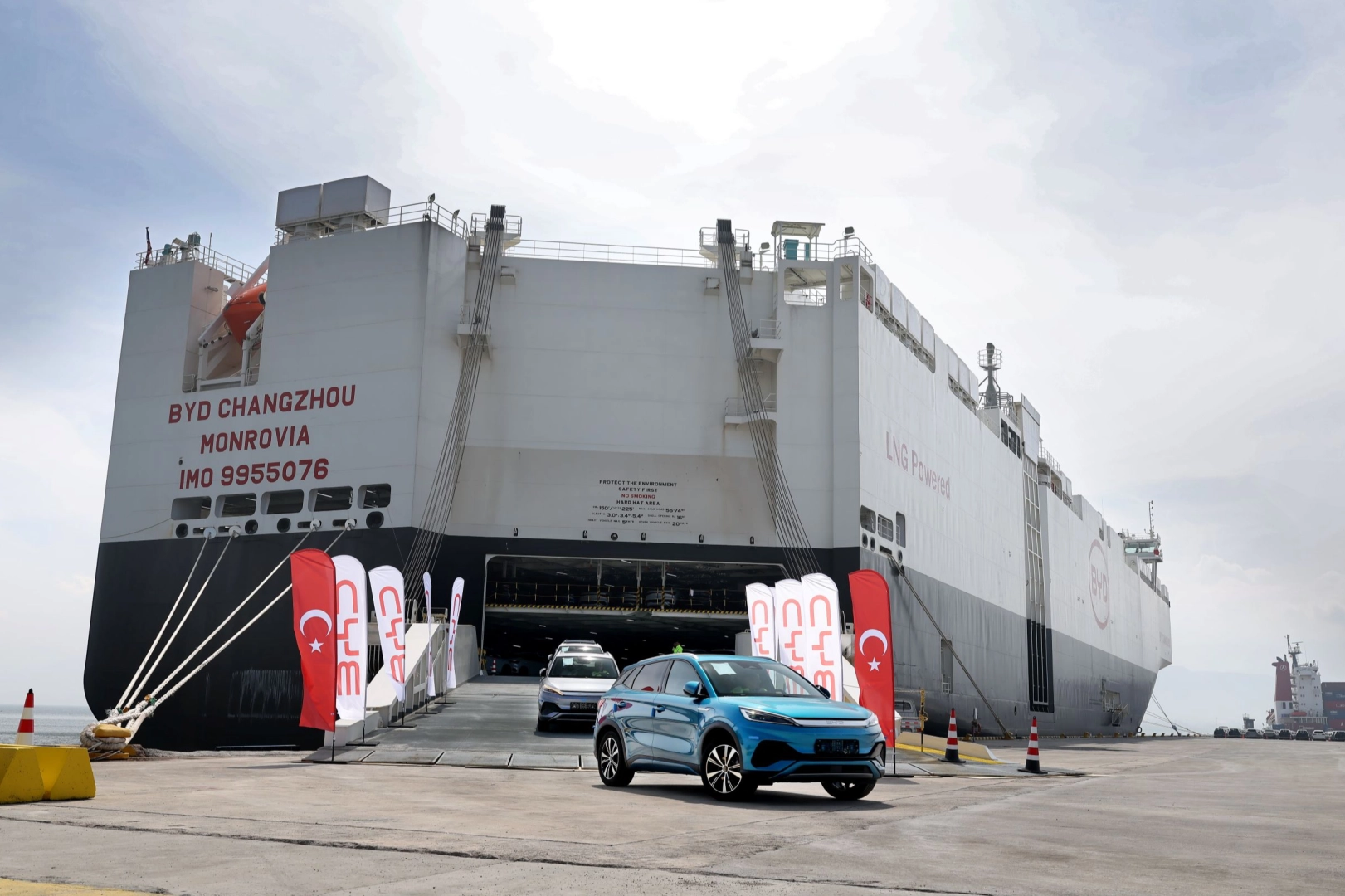 BYD’nin Türkiye’de satış adetlerinin artışına paralel, BYD’nin ileri teknolojiye sahip araç taşıma gemisi “BYD CHANGZHOU”, Türkiye’ye teslimat yapmak üzere 25 Şubat’ta Çin’in Ningbo Limanı’ndan yola çıktı. Yaklaşık 39 günlük bir yolculuğun ardından, 5 Nisan’da Türkiye’ye ulaştı. Kocaeli Derince’deki Safiport Limanı’na yanaşan 7.000 araç kapasiteli dev BYD CHANGZHOU gemisinin, Türkiye’ye gelişi büyük ilgi uyandırdı.