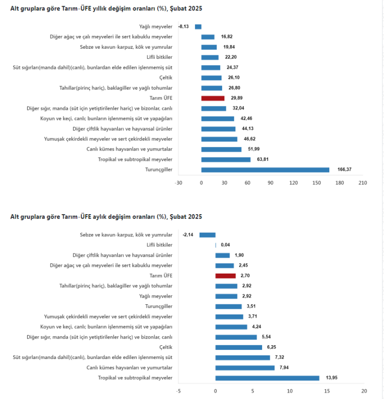 Tarım ürünleri üretici fiyat endeksi (Tarım-ÜFE) yıllık yüzde 29,89, aylık ise yüzde 2,70 artış kaydetti. Yıllık değişimde Tarım ÜFE'de en çok değişim turunçgillerde olurken, aylık değişimin lideri de tropikal ve subtropikal meyveler oldu.