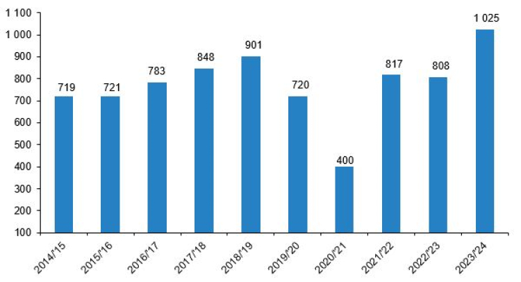 2023-2024 sezonunda tiyatro salonu sayısı yüzde 26,9 artarak bin 25’e, koltuk sayısı 431 bin 631’e çıktı. Tiyatro seyircisi yüzde 28,2 artışla 8 milyon 53 bin 186’ya ulaştı.