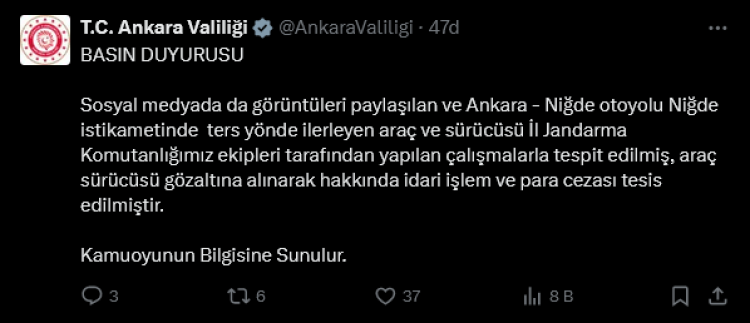 Ankara Valiliği, sosyal medyada paylaşılan ve Ankara-Niğde Otoyolu’nda ters yönde ilerleyen aracı tespit ederek sürücüsünü gözaltına aldı. Sürücüye idari işlem ve para cezası uygulandı.