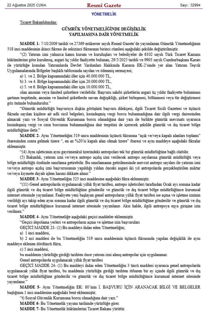 Antrepo alanlarının en az yüzde 20’sinin kapalı alan olacağı ve aynı işleticinin aynı gayrimenkuldeki antrepoları tek bir gümrük müdürlüğüne bağlanabileceğinin altı çizilen yönetmelik değişikliğinde Bakanlık, antrepo sayısına gümrük veya bölge müdürlüğü bazında sınırlama getirebilecek; bu karar, mevcut antrepo sayıları ve son iki yıldaki işlem hacmine göre alınacak.