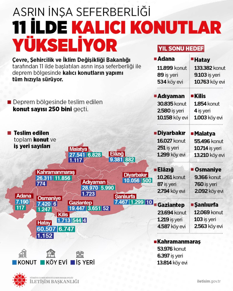 Başkanlık, Cumhurbaşkanı Recep Tayyip Erdoğan’ın öncülüğünde, Çevre, Şehircilik ve İklim Değişikliği Bakanlığı tarafından yürütülen “asrın inşa seferberliği” kapsamında, deprem bölgesinde kalıcı konutların inşası hızla sürdüğü belirtilen infografik yayımladı.