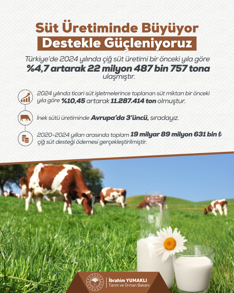 Bakan Yumaklı, paylaşımında, inek sütü üretiminde Avrupa'da üçüncü sırada olunduğunu belirterek, 2020-2024 yılları arasında toplam 19 milyar 89 milyon 631 bin lira çiğ süt desteği ödemesinin gerçekleştirildiğini kaydetti.