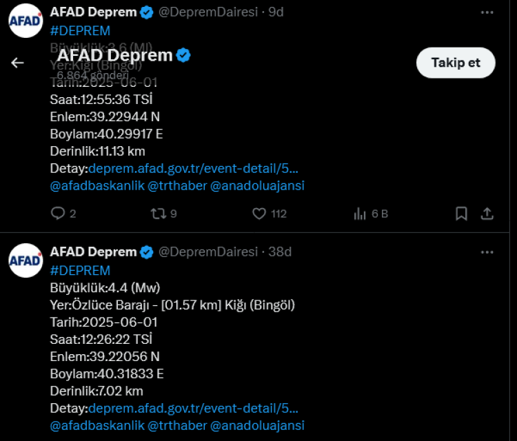 AFAD, Bingöl'de yaklaşık yarım saat arayla iki büyük deprem kaydetti. Saat 12.26'daki 4,4 büyüklüğündeki sarsıntı sonrasında saat 12.55'de 3,6 büyüklüğünde bir deprem daha meydana geldi.