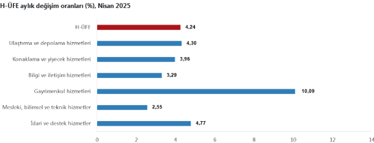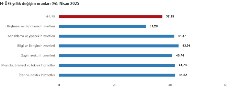TÜİK verilerine göre, Nisan 2025’te Hizmet Üretici Fiyat Endeksi (H-ÜFE) yıllık yüzde 37,15, aylık yüzde 4,24 yükseldi. En yüksek aylık artış yüzde 10,09 ile gayrimenkul hizmetlerinde kaydedildi.