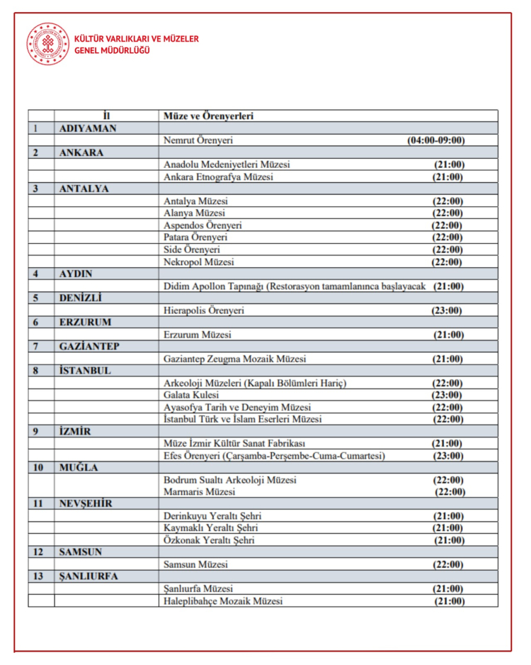 Kültür ve Turizm Bakanlığı, “Gece Müzeciliği” uygulamasıyla müze ve antik kentleri gece de ziyarete açtı. T.C. vatandaşı Müzekart sahipleri, 100 TL ek ücretle 1 Haziran-1 Ekim 2025 arasında akşam 19:00’dan itibaren bu alanları gezebilecek. İşte o müzeler ve saatleri...