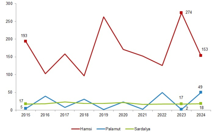 Deniz ürünleri avcılığı yüzde 23,3 gerilerken, iç su ürünleri avcılığı yüzde 0,2 artış gösterdi. Avlanan deniz balıkları 290 bin 68 ton olarak kaydedildi. Hamsi, 153 bin 175 tonla en çok avlanan tür olurken, onu 49 bin 278 tonla palamut ve 17 bin 818 tonla sardalya izledi.