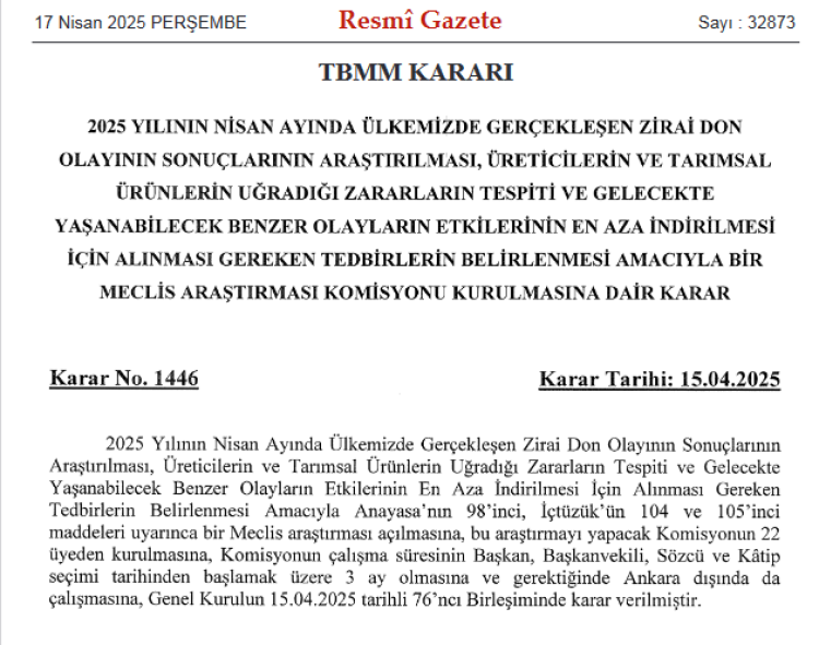 Birçok ilde tarım sektörünü olumsuz etkileyen zirai don olayının yol açtığı zararları incelemek üzere Meclis Araştırma Komisyonu kurulmasını kararlaştıran TBMM kararı, bugünkü Resmi Gazete’de yayımlandı.