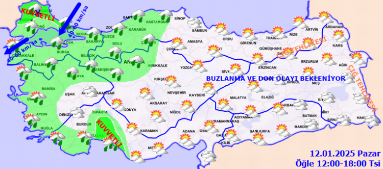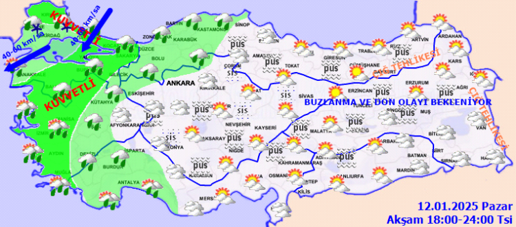 Türkiye'nin iç ve doğu kesimlerinde buzlanma ve don ile birlikte pus ve yer yer sis görülmesi beklenirken, Doğu Karadeniz’in iç kesimlerinin yüksekleri ile Doğu Anadolu’nun yüksek ve dik yamaçlarında çığ tehlikesi bulunuyor. Meteoroloji tarafından yapılan 'kuvvetli' uyarılar arasında, vatandaşların yaşayabileceği yağış, buzlanma ve çığ tehlikesine karşı dikkatli ve tedbirli olunması istendi.