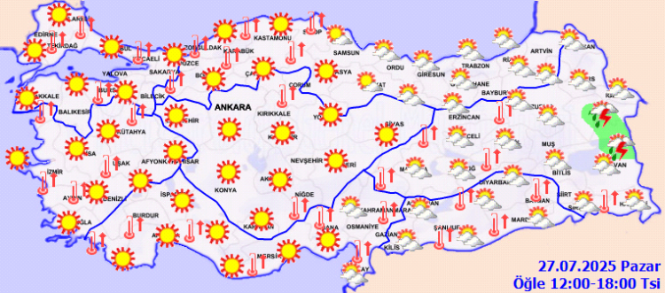 Meteoroloji Genel Müdürlüğü, 27 Temmuz 2025 tarihli hava durumu tahmin raporunu yayımladı.