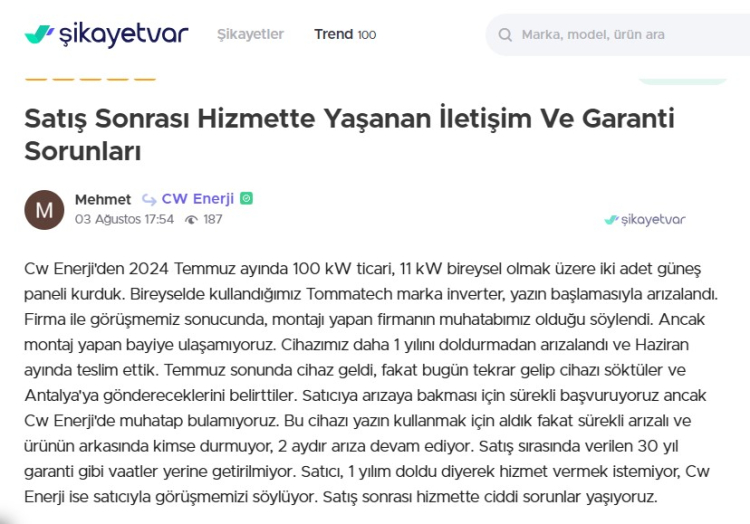 Mehmet isimli bir vatandaş, CW Enerji’nin satış sonrası hizmette iletişim ve garanti sorunu yaşanmasına sessiz kaldığının altını çizerek şunları kaydetti;