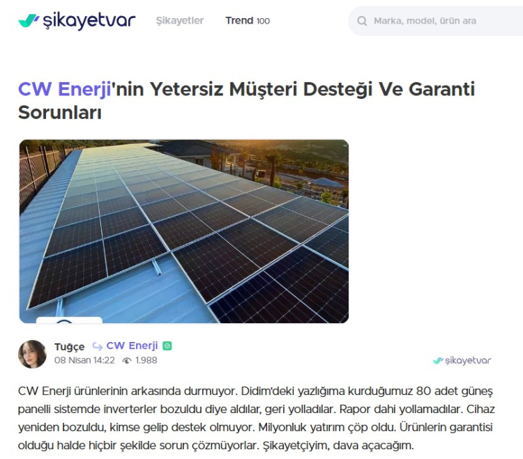 Bir vatandaş da, aldığı ürünün kısa sürede bozulduğuna dikkat çekerek, “CW Enerji ürünlerinin arkasında durmuyor. Didim'deki yazlığıma kurduğumuz 80 adet güneş panelli sistemde inverterler bozuldu diye aldılar, geri yolladılar. Rapor dahi yollamadılar. Cihaz yeniden bozuldu, kimse gelip destek olmuyor. Milyonluk yatırım çöp oldu. Ürünlerin garantisi olduğu halde hiçbir şekilde sorun çözmüyorlar. Şikayetçiyim, dava açacağım.” ifadelerini kullandı.