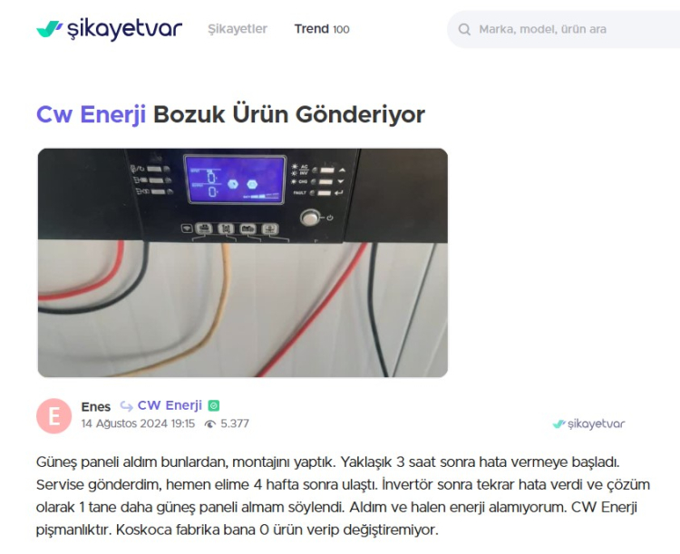 Duruma isyan eden bir vatandaş da, “Güneş paneli aldım bunlardan, montajını yaptık. Yaklaşık 3 saat sonra hata vermeye başladı. Servise gönderdim, hemen elime 4 hafta sonra ulaştı. İnvertör sonra tekrar hata verdi ve çözüm olarak 1 tane daha güneş paneli almam söylendi. Aldım ve halen enerji alamıyorum. CW Enerji pişmanlıktır. Koskoca fabrika bana 0 ürün verip değiştiremiyor.” diyerek isyan etti.